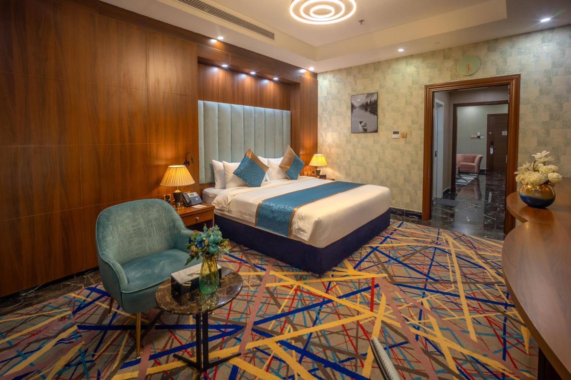 غرفـة نـوم مـع سـرير كبيـر ومكتـب مناســب مــع غرفــة معيشــة والاســتمتاع بالمناظـر المزدوجـة للمدينـة ومطـار الملـك عبــد العزيــز مــع اتصــال مجانــي عالــي الســرعة بالإنترنــت ومجهــز بشاشــتين تلفزيـون ومجموعـة أريكـة فاخـرة وطاولـة طعــام وحمــام رخامــي و ثيــاب حمــام ناعمة.